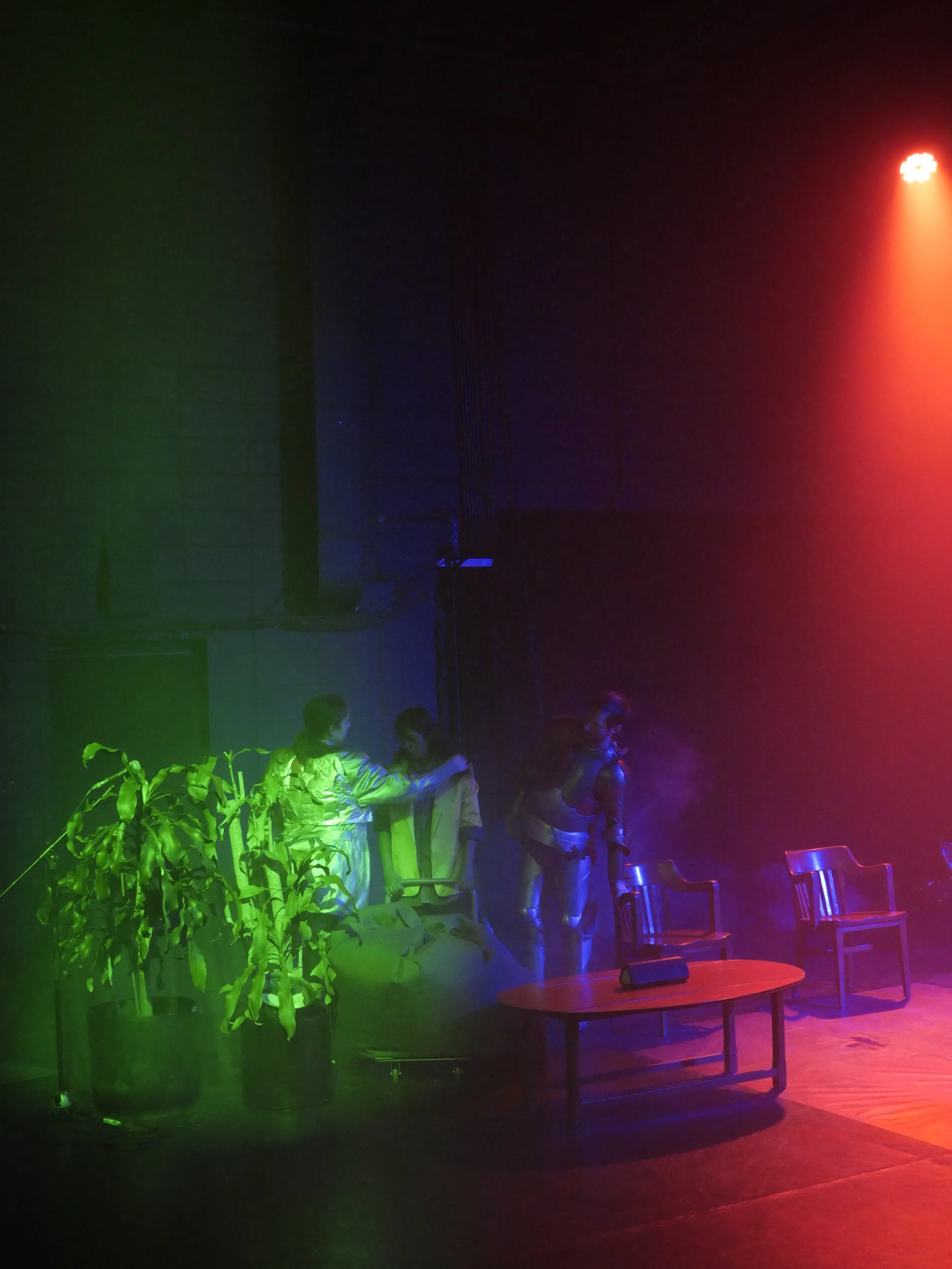 1h pour sauver le théâtre est un projet scénique s'intéressant au statu quo, aux systèmes de privilège, aux dynamiques de pouvoir ainsi qu'à cette zone poreuse qui permet à la fiction de cohabiter avec la réalité. La déconstruction des privilèges et la prise de conscience de notre impact sur les êtres vivants avec lesquels nous coexistons constituent les racines de la solution à l'ensemble des grands problèmes sociaux et environnementaux de notre époque. 1h pour sauver le théâtre constitue à la fois une métaphore du statu quo écologique de notre société, qui, devant l'imminence de la fin, demeure figée dans des pratiques écocidaires sous prétexte de la protection de l'économie, et une réflexion plus large sur le vivre-ensemble. Par un travail d'états de corps, ce spectacle explore la zone floue qui nous fait passer d’un répertoire quotidien à quelque chose de grandiose. Quels sont les interrupteurs qui nous font osciller entre réalité et fiction ? Ce spectacle propose des images polysémiques qui évoluent lors de la représentation et nous fait traverser les binarités micro/macro, banal/fantastique et inaction/surproduction. Cette lente transformation permet de passer d'une réflexion (et d'un mouvement) à l'autre sans distinctions, comme lorsqu'on observe les nuages dans le ciel changer de formes à notre insu.